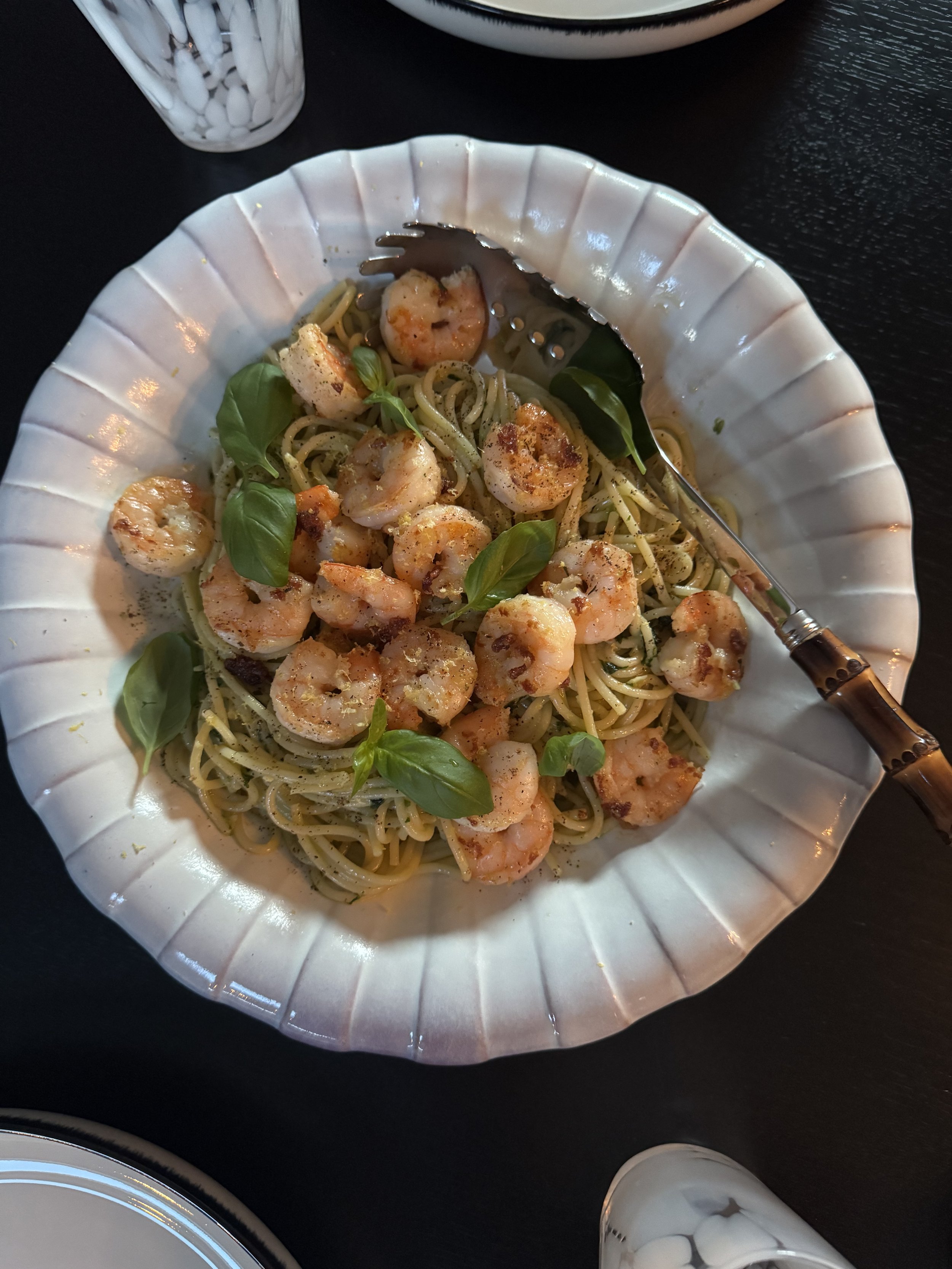 In the end, fry some sustainably sourced shrimps in a pan with butter and some sea salt. Top off the pasta with the shrimps, lots of lemon zest, fresh basil leaves and fresh black pepper.